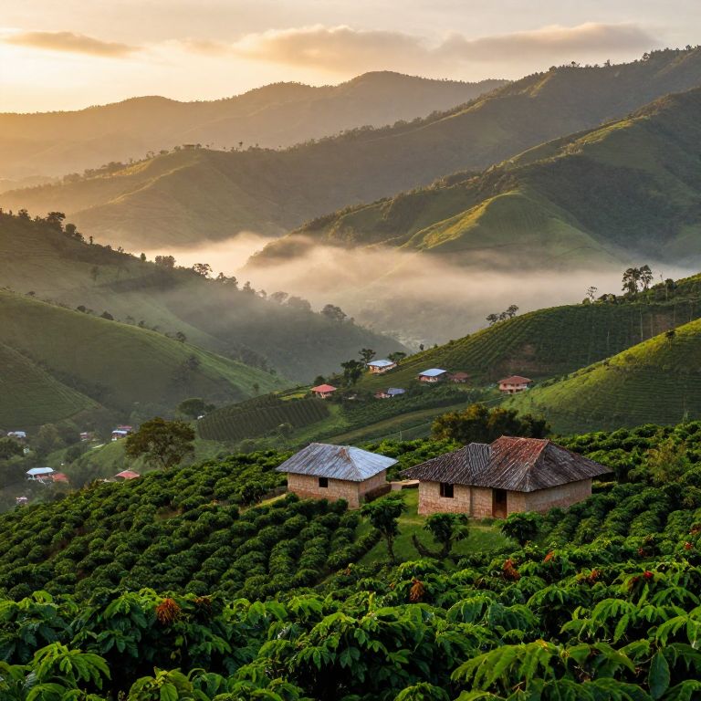 Colombian landscape at sunrise, lush green mountains, vibrant coffee plantations, mist swirling over valleys, traditional rustic houses, warm golden light, hyper-realistic style with rich colors and fine details