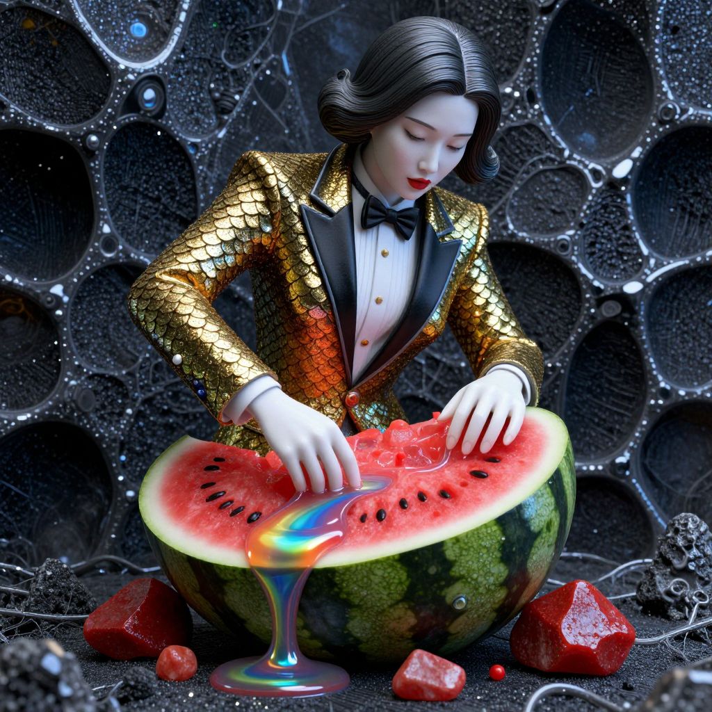 A surreal, post-punk statue of a Korean woman in a high fashion tuxedo with goldfish scales glitter hybrid, crushing a watermelon with a luscious, rainbow liquid bismuth and red rough stone mix, set against a background of graphene and fulgurite, with intricate surface detail, thick cracks, and chemiluminescence.