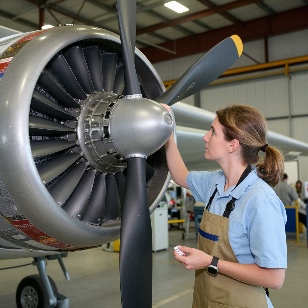 Woman inspecting a large aircraft engine propeller at the North American Aviation, Inc., plant in California, wearing a work apron and holding a small object in her hand.