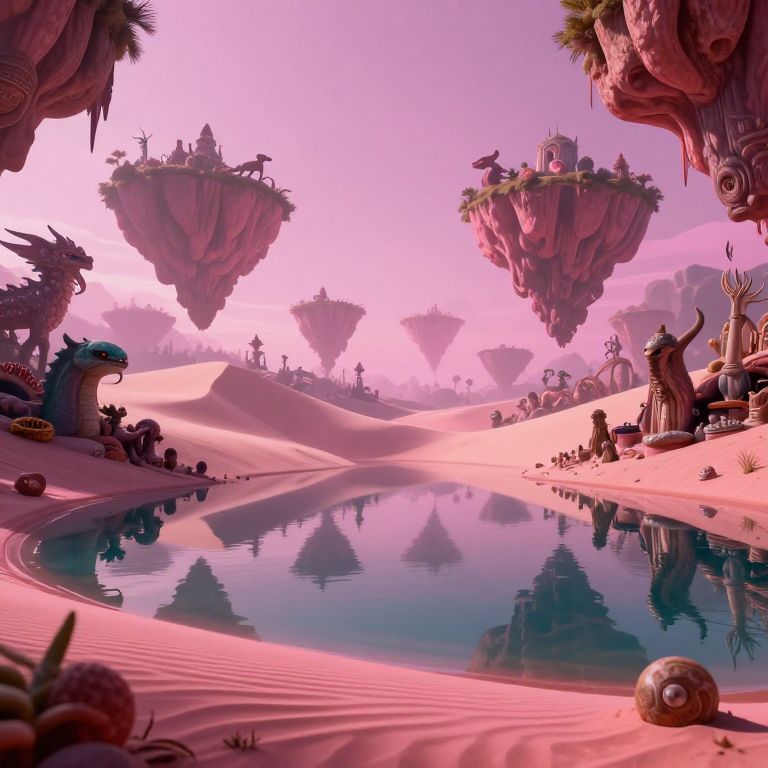 A surreal dreamscape featuring a tranquil lake reflecting an otherworldly scene with floating islands of sand dunes, bathed in radiant pink hues. The viewer is immersed in this hallucinogenic landscape from an underwater vantage point, surrounded by fantastical creatures and enigmatic artifacts from ancient civilizations. This captivating image combines elements of wonder and unease to challenge our perception of reality, evoking a sense of nightmarish beauty that defies conventional understanding.
