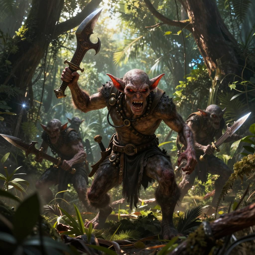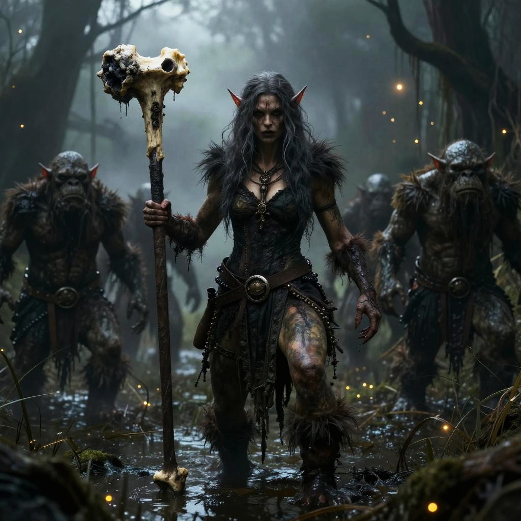 Realistic photo.A savage troll queen leading a clan of swamp trolls, in a murky marshland, holding a massive bone club, dark and ominous, with shadows creeping through the fog, will-o'-the-wisps flickering, epic and dramatic realistic photo