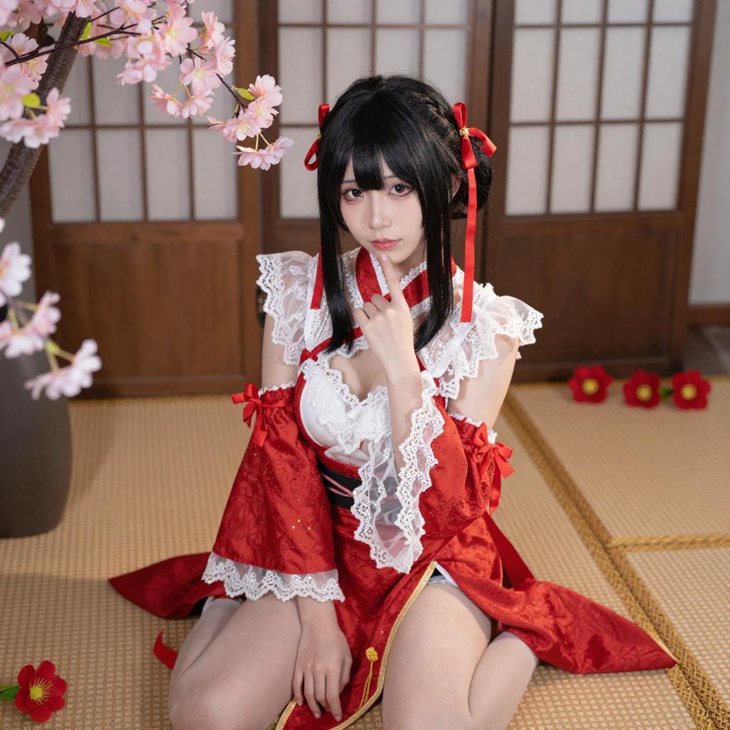 Photograph of an Asian woman with black hair in a red and white lace cosplay outfit, sitting on a tatami mat. She has a red ribbon in her hair and is surrounded by pink cherry blossoms and red flowers. She is touching her chin with her right hand, looking at the camera. The background features a wooden folding screen.