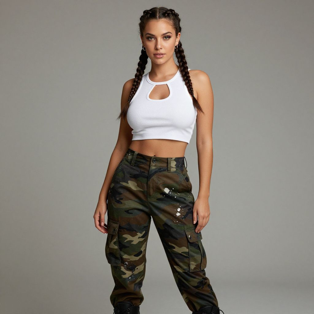 "Woman, streetwear, white cropped tank top with a keyhole cutout at the neckline, high-waisted camouflage cargo pants with paint splatter detail, black lace-up boots, small hoop earrings, two braids, photo studio background. Sexy. Pretty face and beаutiful eyes. Big breasts."
