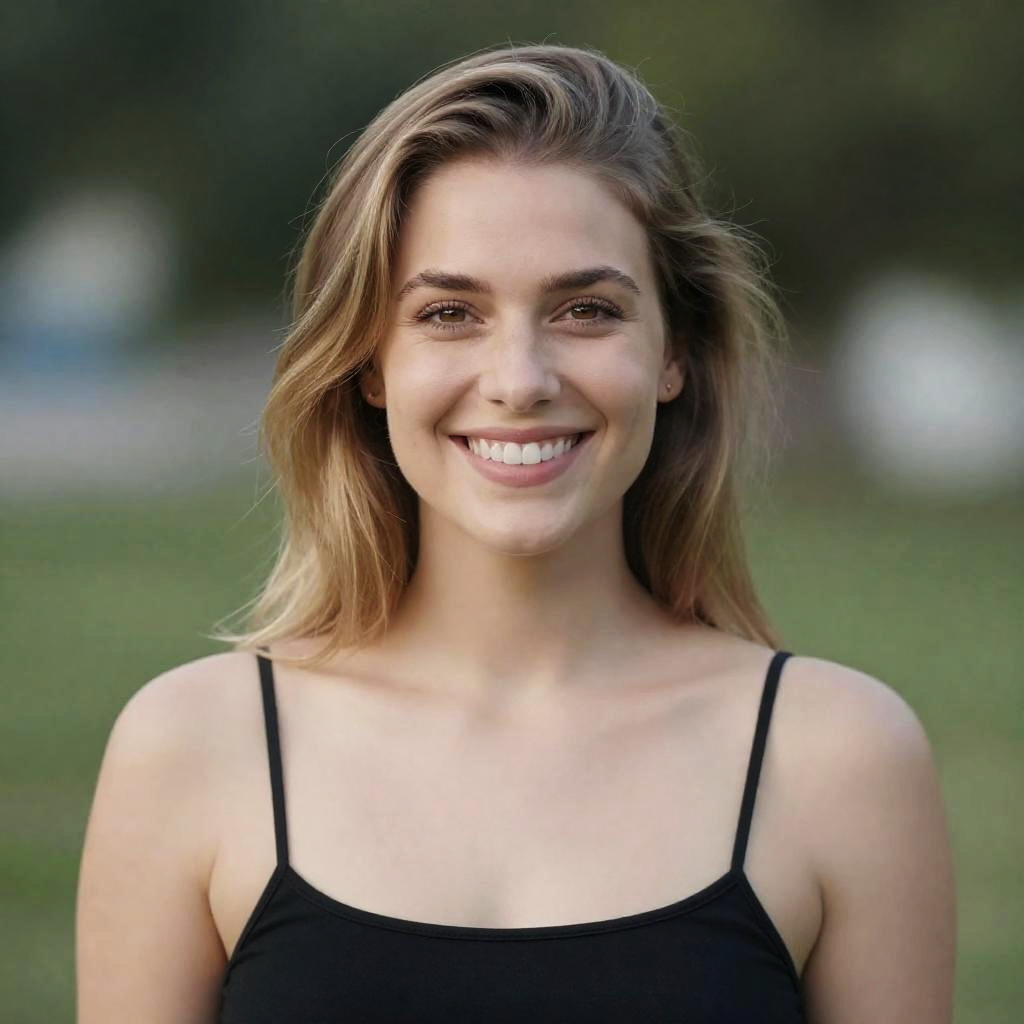 Photograph of a smiling woman with shoulder-length blonde hair, light skin, and brown eyes, wearing a black spaghetti-strap top. She is outdoors with a blurred green and blue bokeh background. She looks directly at the camera.
