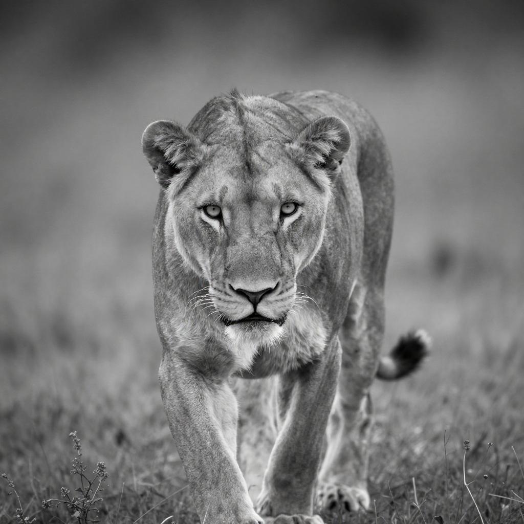 Photograph of a young lioness lying in tall, dry grass with a slight downward camera angle. Her golden-brown fur contrasts with the green and brown grass. The lighting is natural, highlighting her focused, amber eyes. The background is softly blurred, emphasizing the lioness in the foreground. Depth of field is shallow, with the lioness in sharp focus.
