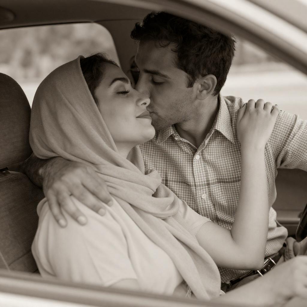 Sepia-toned photograph of a man leaning in to kiss a woman inside a car. The man has short, dark hair, wears a checkered shirt. The woman, with a headscarf and light-colored dress, looks up at him with closed eyes. His right arm is around her neck, her left hand rests on his shoulder. Both appear relaxed. The car's interior is visible in the background. The man's face is partially obscured by her head.