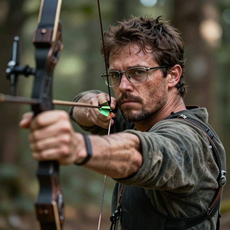 Photograph of a rugged, bearded man with short, messy brown hair and glasses, drawing a black compound bow with a green arrow nocked. He wears a dark green, slightly worn hoodie and a black wristband on his right wrist. His intense focus is directed at the bowstring. The background is a blurred forest with tall trees, creating a natural, outdoor setting. The image has a sharp focus on the man, highlighting the details of his determined expression and the texture of his clothing. The lighting is natural, enhancing the earthy tones of the scene.