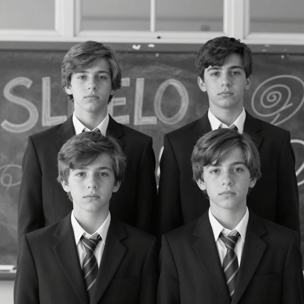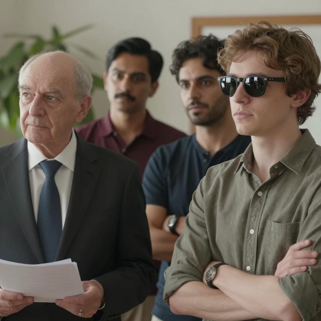 Five people seated at a table. From left to right: older woman with dark hair, light brown blouse, slightly stern expression; young boy with short brown hair, beige jacket, resting head on table, eyes closed; teenage boy with dark hair, blue blazer, holding a picture, neutral expression; bald older man with mustache, dark suit, white shirt, brown tie, smiling; green table in foreground. Dark, plain background.