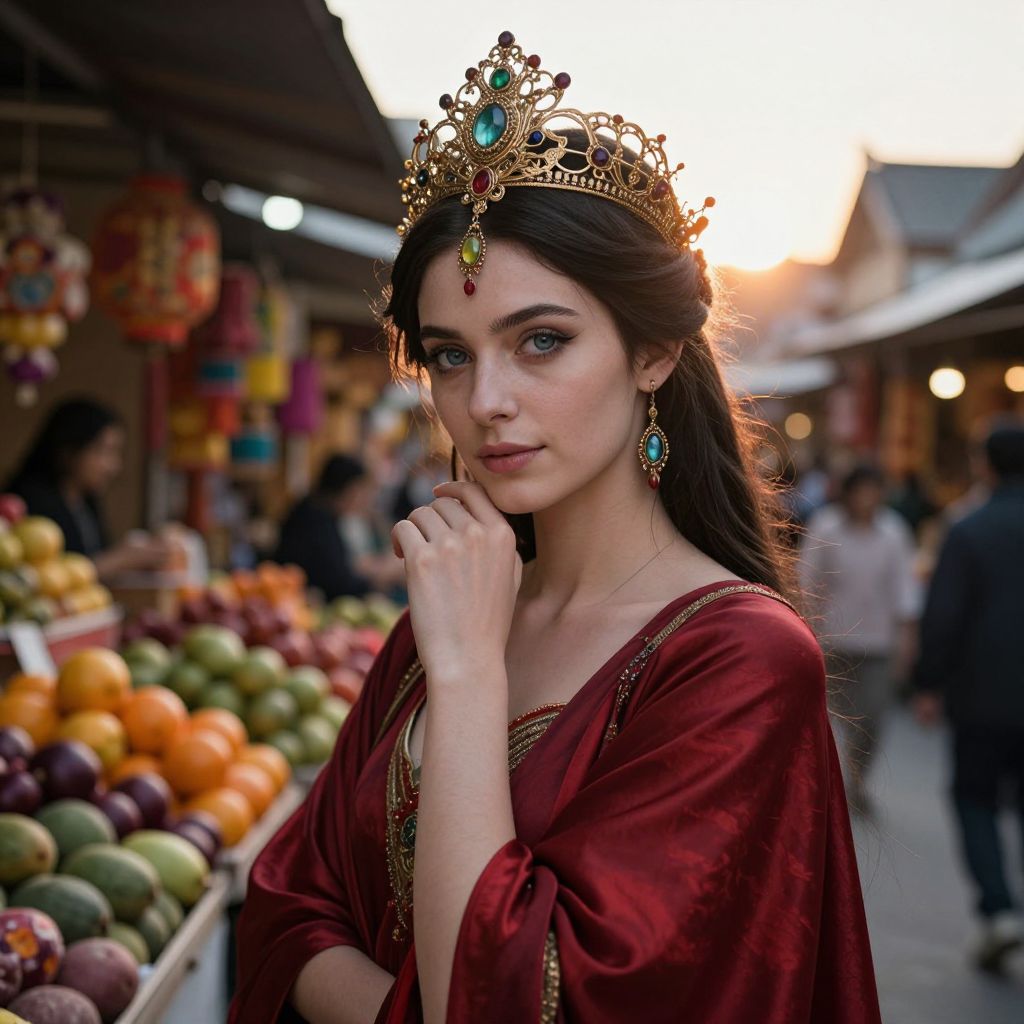 Photograph of a young, fair-skinned woman with long, dark brown hair, wearing a gold, jeweled crown and matching turquoise earrings. She has blue eyes, a slender build, and is dressed in a deep red, velvet gown with gold trim. Her right hand rests thoughtfully near her chin. She stands in a bustling outdoor market, with colorful fruits, including oranges, melons, and grapes, in the background. The market stalls and blurred figures of people add a lively, textured backdrop, with the sunset casting a warm, golden light over the scene. The woman's regal appearance contrasts with the everyday market setting.