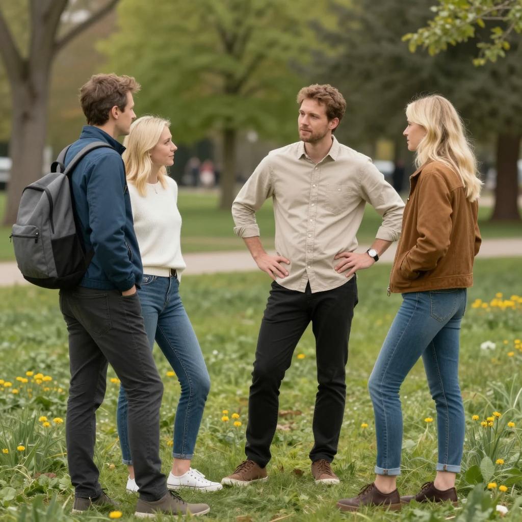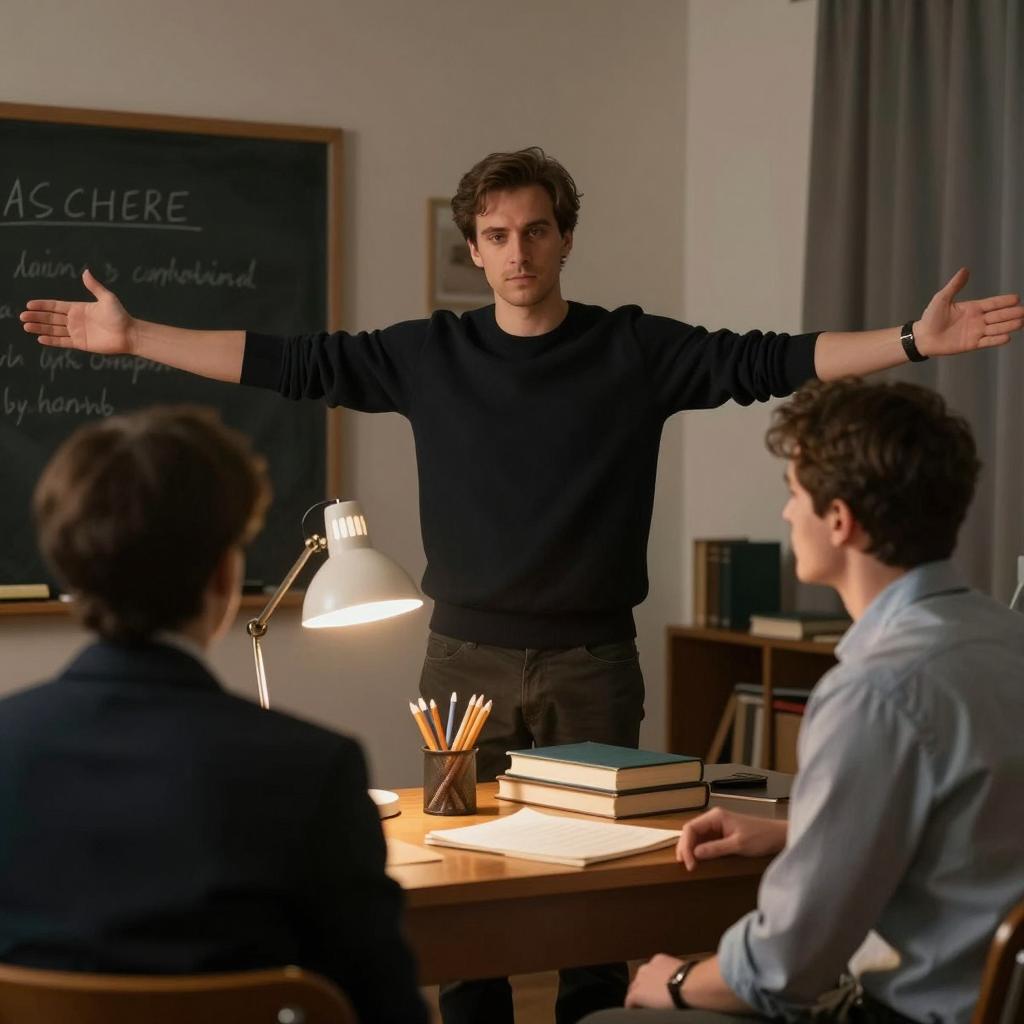Three men in an office. Left man in dark blue coat, black gloves, grabbing right arm of center man in orange shirt. Center man with short brown hair, smiling, being hugged from behind by right man in light blue shirt, dark pants. Wooden bookshelves in background. All men have light skin, short hair. Right man smiling. Center man's face not visible.