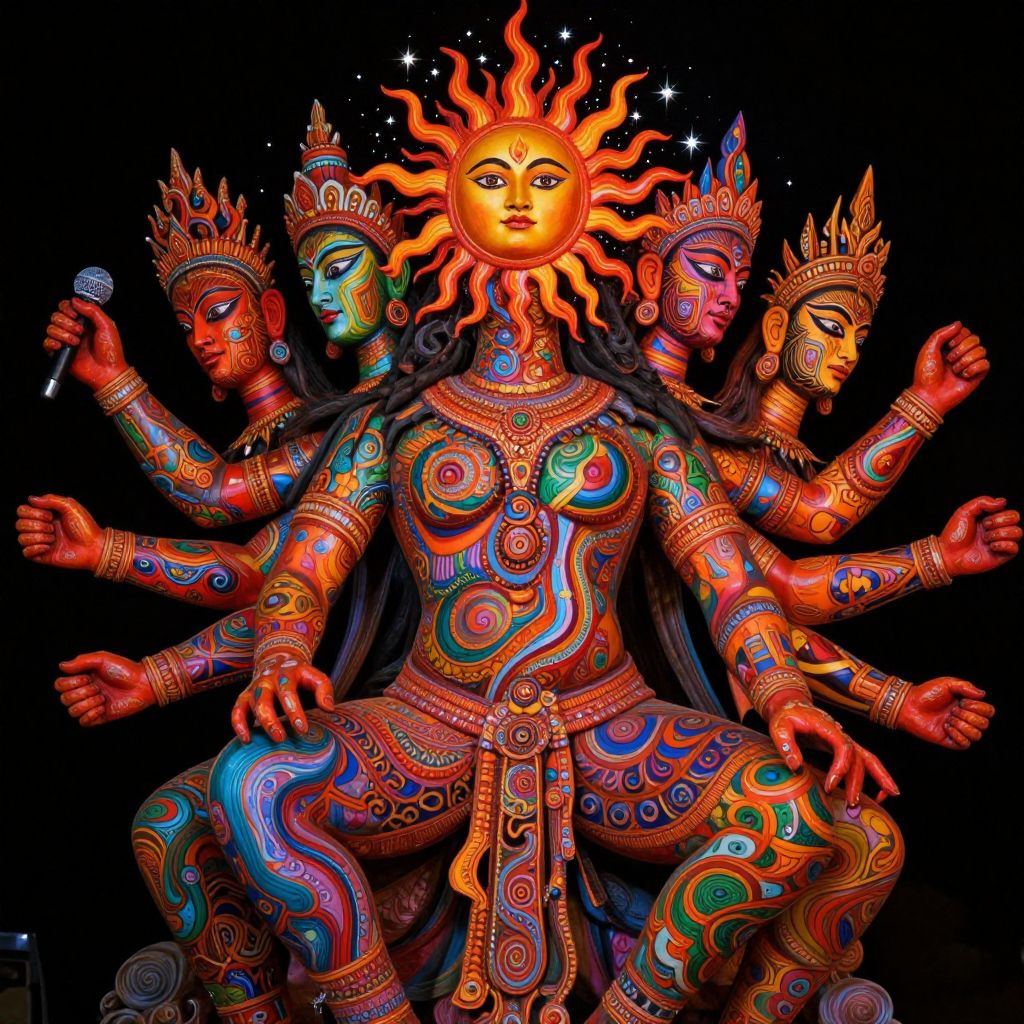 The image presents a vivid and complex scene featuring a central figure with multiple heads, reminiscent of the mythological character Ravana, known for having ten heads. The heads are adorned with intricate patterns and vibrant colors, ranging from fiery reds and oranges to cool blues and greens, creating a striking contrast against the dark background. Each head is unique, with varying expressions and designs, some resembling human faces, while others appear more abstract. The central head, positioned at the top, is particularly striking, with a sun-like face surrounded by swirling flames and stars, evoking a sense of cosmic energy. Surrounding this central figure are additional heads, each with its own distinct features and patterns, contributing to a sense of depth and complexity. The overall composition is dynamic, with elements reaching out and interacting, creating a sense of movement and tension. The use of light and shadow is masterful, with bright spots of light contrasting against the dark background, adding to the psychedelic and surreal atmosphere. The image is rich in detail, with a variety of textures and patterns, from smooth, flowing lines to intricate, painted designs, all contributing to a visually captivating and immersive experience.