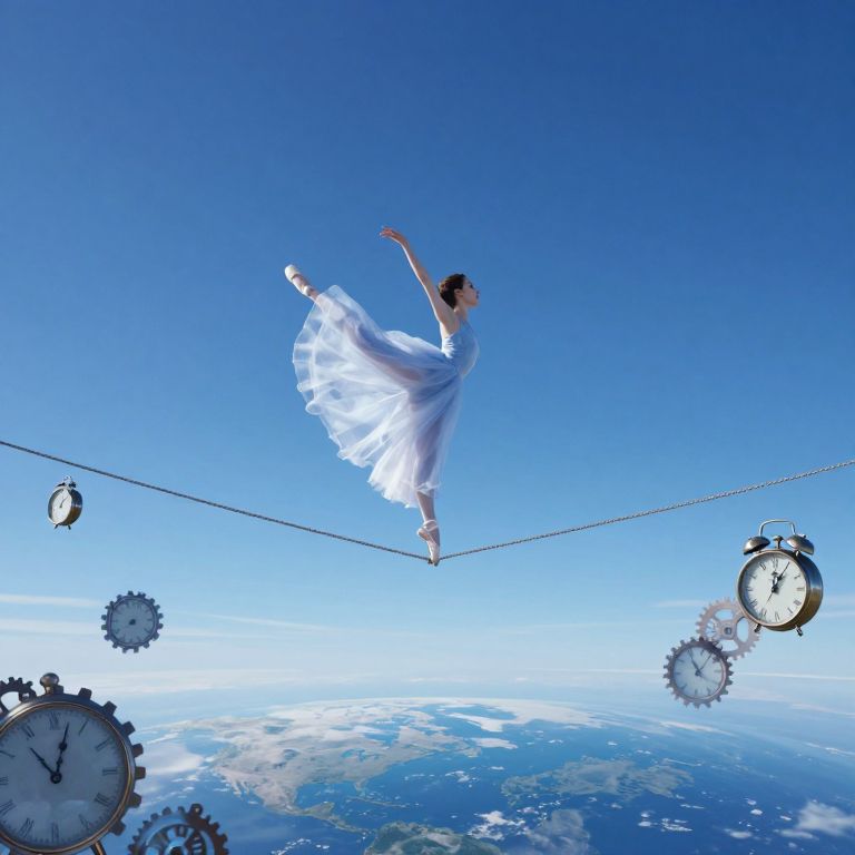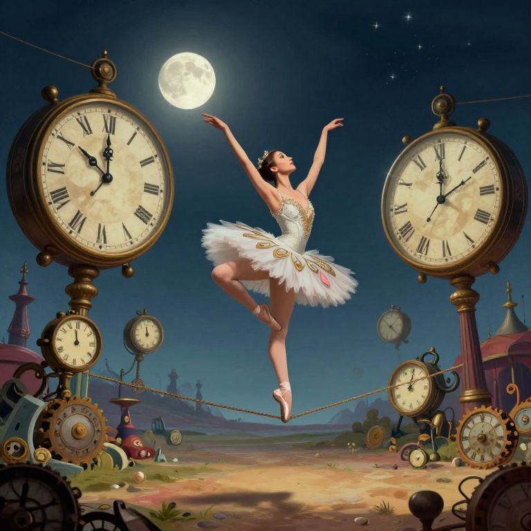 In a surreal landscape reminiscent of Dali-esque dreamscapes, a modern dancer in an flowing crimson leotard performs a gravity-defying leap across the fantastical terrain. The background features a melting timepiece draped over the edge of a vast precipice overlooking an endless chasm, while the foreground showcases an intricately detailed cityscape emerging from the depths below. This unique perspective, captured from a low-angle view looking up at the dancer, evokes both wonder and unease as the scene blurs the lines between reality and dreams, symbolizing the fleeting nature of existence and our ever-changing perceptions of it.