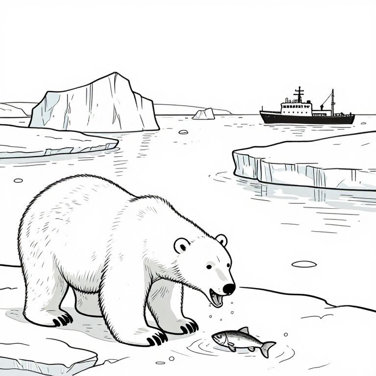 Black and white line drawing of a polar bear eating a fish on an icy sea, with icebergs and a ship in the background.