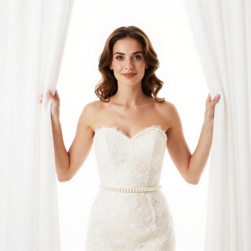 Woman with light skin and brown hair, wearing a white, strapless lace wedding dress with a pearl belt, stands between white curtains. She holds the curtains open with both hands, looking forward with a slight smile. Bright, white background.