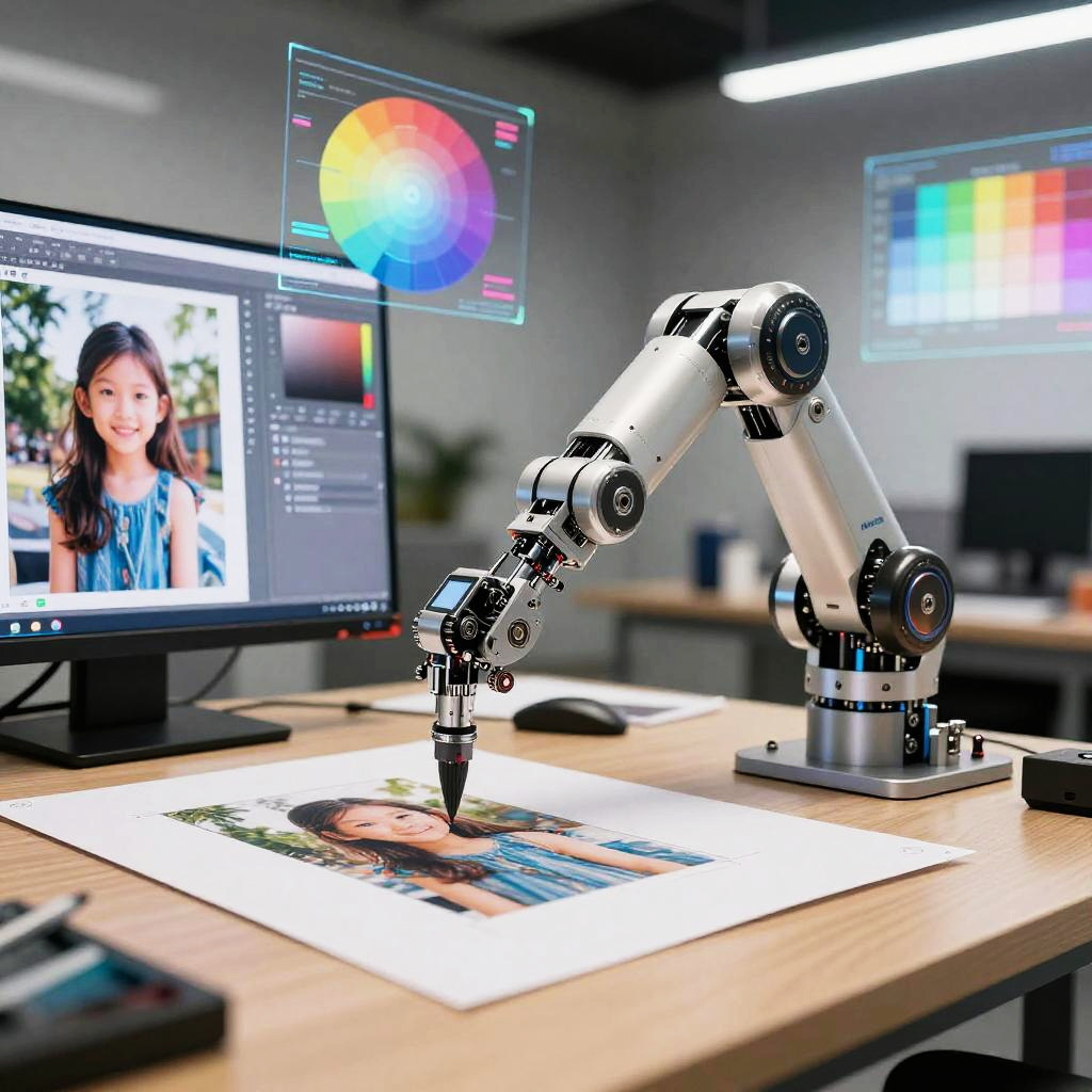 Photograph of a modern workspace with a robotic arm on a wooden desk. The robotic arm, silver and black, is drawing on a photograph of a smiling young woman with long black hair, wearing a blue top. Behind the arm, a computer monitor displays the same woman's face on a graphic design software. Above the monitor, a colorful spectrum graphic and a bar chart are displayed on a projected screen. The background includes blurred office elements, with soft lighting and a potted plant. The overall scene blends technology and art in a sleek, contemporary setting.