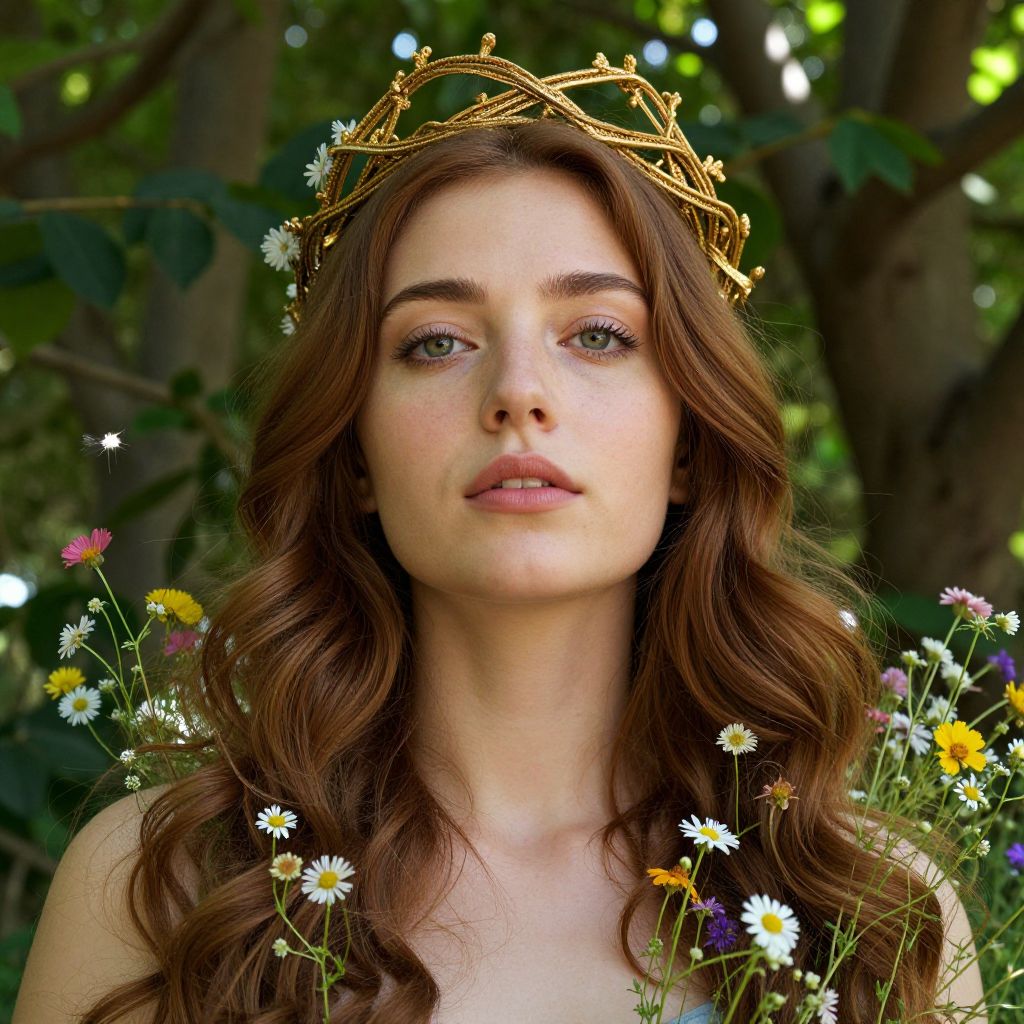 A photorealistic portrait of a young Mediterranean woman with porcelain skin and high cheekbones captures her kind green eyes, which seem to hold ancient wisdom. She wears a intricate golden crown entwined with vines, glistening in the dappled sunlight filtering through ancient foliage. Her long chestnut hair cascades over her shoulders in gentle waves, accented by wildflowers that echo the vibrant hues of a nearby meadow. The unique low-angle perspective enhances her grandeur, creating an emotional blend of reverence and wonder within nature's embrace.