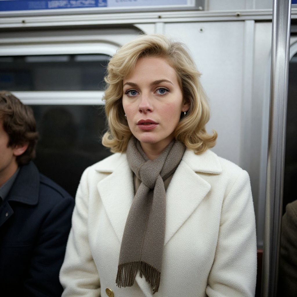 In this striking black-and-white photograph, a young woman exudes grace and power as she strolls down a bustling street in Soho. Her movements are fluid and purposeful, reminiscent of a panther stalking its prey. The woman's face, a study in character and expression, is captured in a side view below eye level, revealing subtle wrinkles and large pores that add depth and realism to her visage. Her hair is styled in elegant curls, secured with a delicate accessory, and she wears a tailored coat that accentuates her poised demeanor. The background is a blur of activity, with other characters in the scene appearing as perfect proportions, their expressions and movements contributing to the dramatic atmosphere. The photograph is a masterful blend of hyperrealism and cinematic elements, with a sharp lens and bokeh effect that enhance the depth and texture of the image. The composition is balanced, with the woman positioned centrally, drawing the viewer's eye into the scene. The use of micro-contrast and tonal grades in the black and white filmstock, Fuji Neopan Acros 100 II, adds a layer of realism and dimensionality, making the photograph a captivating piece of art. The overall effect is one of cinematic intensity, with the woman's presence dominating the frame and the background characters adding to the narrative.