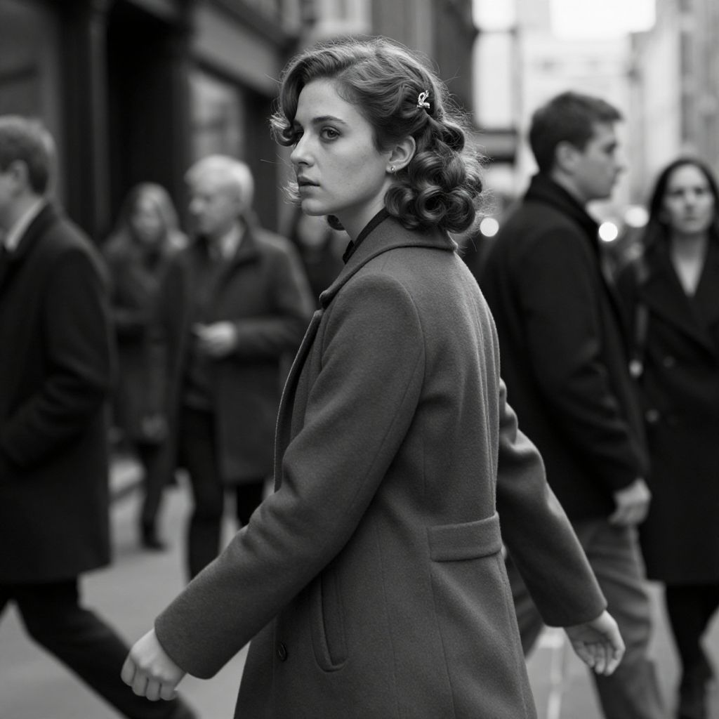 Black-and-white photograph of a serious woman with wavy hair in a 1940s-style coat, walking past blurred, dressed men on a city