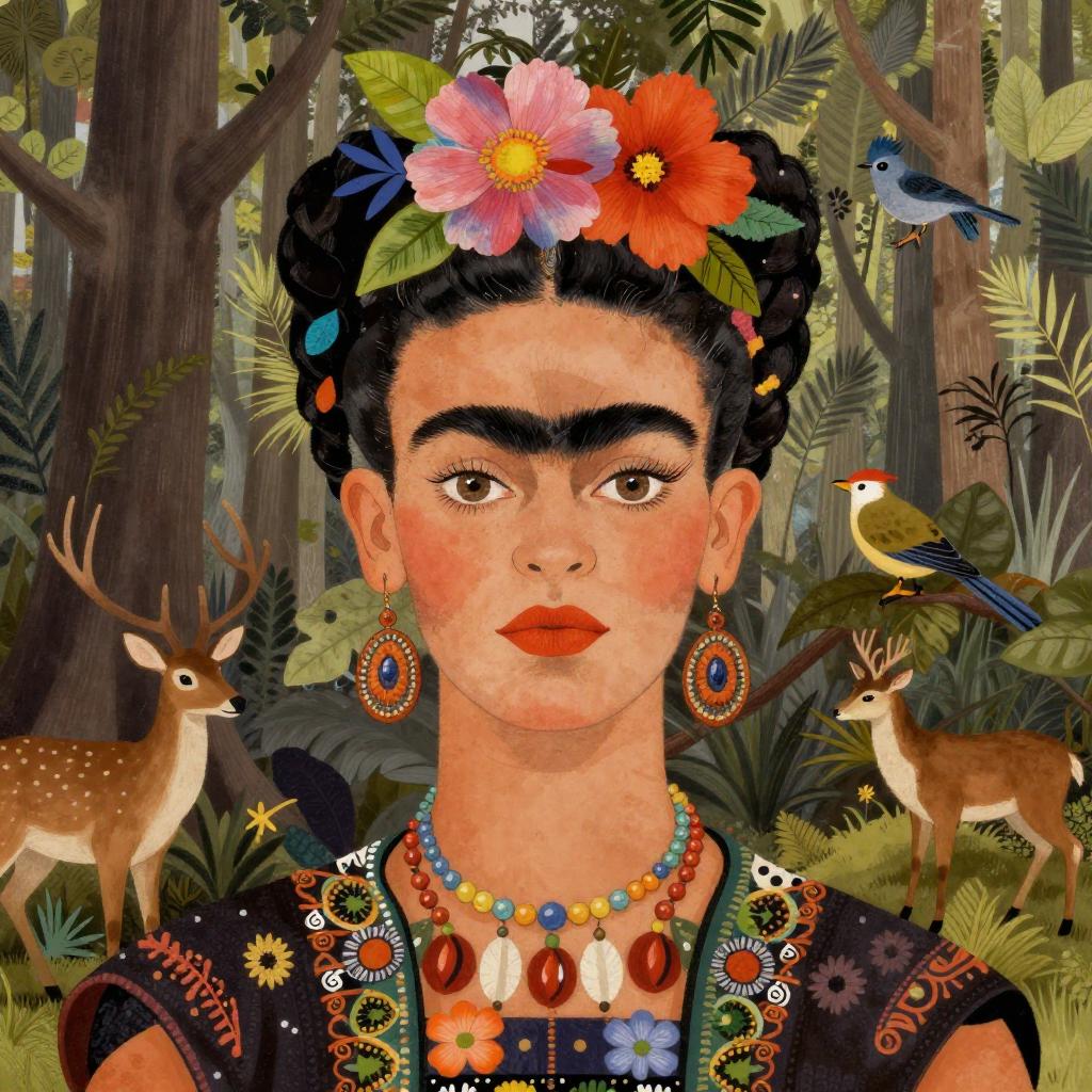 Illustration of a whimsical forest spirit inspired by Frida Kahlo and Surrealism. The subject features a young woman with large brown eyes, braided black hair adorned with vibrant flowers and colorful leaves. She wears ornate earrings and a detailed traditional-style garment with intricate patterns. The background is a stylized forest setting with tall trees and two small animals, a deer and a bird, adding to the mystical atmosphere.
