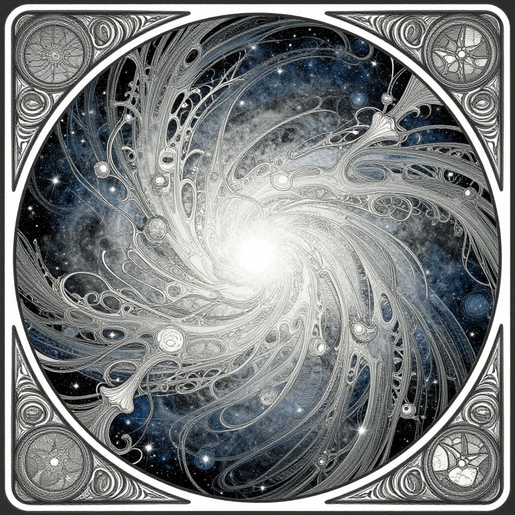 Craft an image in digital art style inspired by Art Nouveau's intricate detailing, depicting a celestial body resembling a radiant nebula from a 'bug's-eye view'. This captivating scene features delicate, flowing lines and organic forms reminiscent of living organisms, with tendrils extending into the vast expanse. The fusion of cosmic beauty and natural elegance evokes an emotional gradient that bridges the gap between these realms, creating a sense of wonder and mystery.