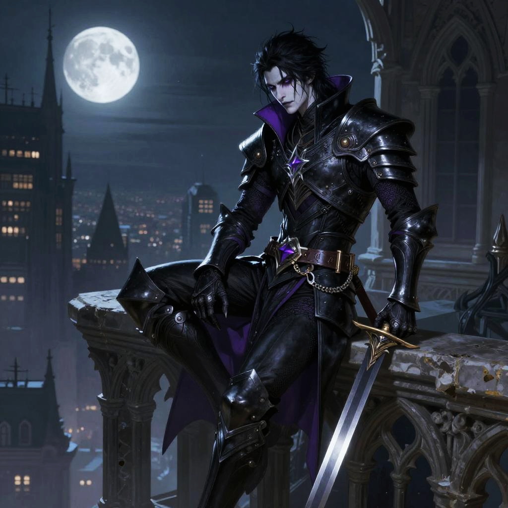 Digital artwork of a dark-haired, muscular male knight with pale skin, dressed in black, ornate armor with purple accents. He sits on a stone balcony under a bright full moon, holding a glowing sword in his right hand. The background features a gothic cityscape with tall, spired buildings. His armor is detailed with intricate patterns, and his expression is serious and focused. The scene is illuminated by the moonlight, casting dramatic shadows. The style is reminiscent of fantasy RPG game art, with a dark, moody color palette.