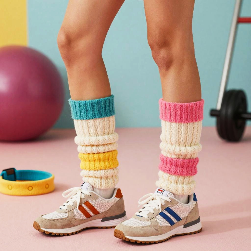 Leg warmers and sneakers on a retro 80s workout scene, bright colors, sweatbands, leg warmers textured knitwear, old school gym, high energy, vintage fitness aesthetic