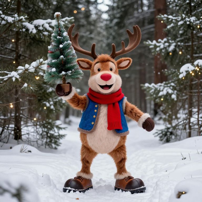 A ridiculous Christmas character dressed as a dancing reindeer with oversized shoes, holding a tiny Christmas tree on its antler, wearing a blue vest and red scarf, standing in a snowy forest with pine trees and twinkling lights, the character has a round face, dark brown eyes, and a goofy, laughing expression, captured in a candid, realistic photography style with soft shadows and frost on the ground.