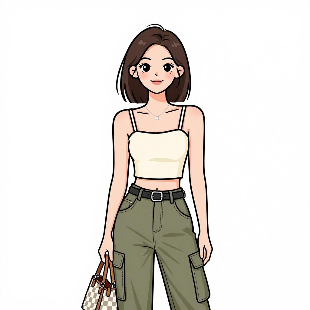 Woman with pretty face and pretty hair. smiling Woman, casual chic, ivory tie-front crop top with spaghetti straps, olive green high-waisted cargo pants with large pockets, slim belt with silver buckle, checkered handbag with structured handles, delicate silver necklace, white background --sref 1467