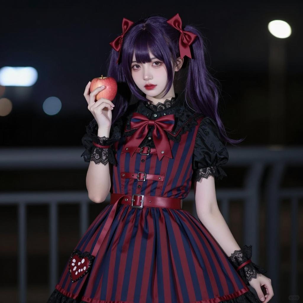 Young woman with pale skin and purple-black hair in twin tails, wearing a gothic Lolita dress with red and blue vertical stripes, black lace sleeves, and multiple red belts. She holds a red apple in her right hand. She stands against a dark, urban night background with blurred city lights. Her expression is neutral. She has red lipstick and wears a red bow in her hair. The image is a photograph.