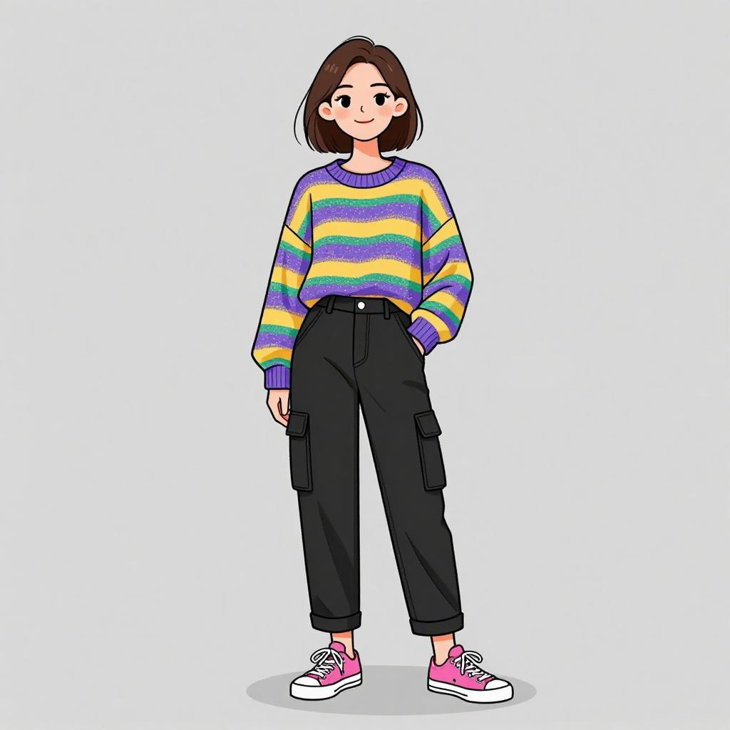 Woman with pretty face and pretty hair. smiling Woman, casual streetwear, multicolored striped sweater with horizontal patterns, crew neck, long sleeves with ribbed cuffs, a mix of purple, yellow, green, and metallic threading, relaxed fit, black cargo pants with side pockets, mid-rise waist, straight leg, pink low-top sneakers with white laces, simple studio background. --sref 1467
