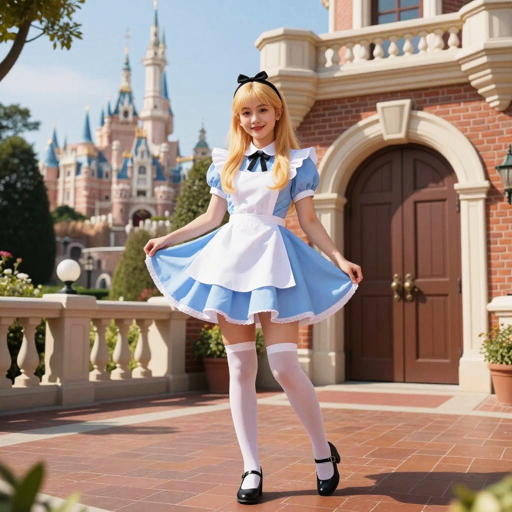 (AliceWonderlandWaifu:1), cute, smile, (dress:1.2), sexy pose, looking at viewer, :D, (big brea BREAK 1.4), curvy, thighhighs, (realistic:1.2), (realism), (masterpiece:1.2), (best quality), (ultra detailed), (8k, 4k, intricate), (full-body-shot:1), (Cowboy-shot:1.2), (85mm), light particles, lighting, (highly detailed:1.2), (detailed face:1.2), (gradients), sfw, colorful, detailed eyes, (detailed ladscape, castle, vegetation, big door:1.2), (bricks, carpet, buildings:1.2), (detailed background), detailed landscape, (dynamic angle:1.2), (dynamic pose:1.2), (rule of third_composition:1.3), (Line of action:1.2), wide shot, solo, daylight