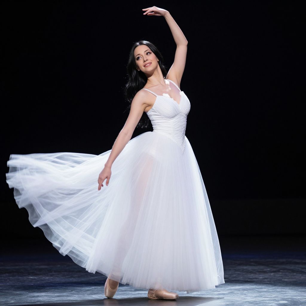 A glamorous ballerina-style woman with long black hair and warm brown eyes wearing a white tulle ball gown as a costume for a performance at a night-time theater event, standing on a stage with a spotlight hitting her back, the gown flowing dramatically as she raises one arm, evoking grace and elegance.. The woman has big breasts and cute face