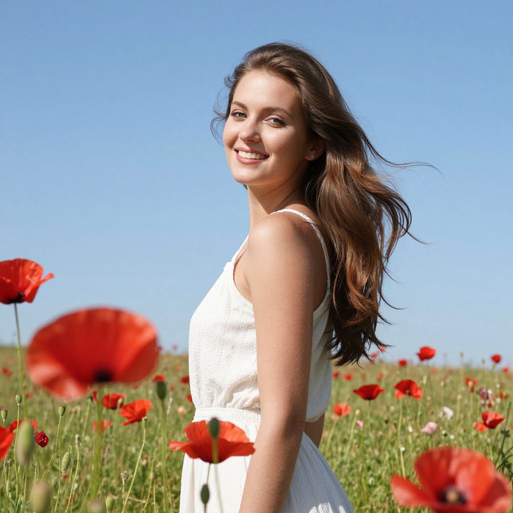 Photograph of a young woman with long, wavy brown hair and fair skin, smiling over her shoulder at the camera. She is wearing a sleeveless, white, summer dress and standing in a vibrant field of red poppies under a clear, blue sky. The poppies are in the foreground and background, with some slightly out of focus, adding depth to the image. The woman's dress has a subtle texture, and the sunlight enhances her natural beauty and the vivid colors of the flowers. The overall mood is cheerful and serene.