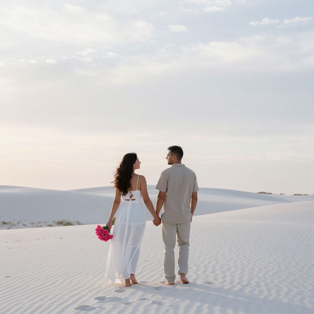 Couple walking hand-in-hand along the vast expanse of White Sands, the woman in a flowing white dress holding a bouquet of vibrant pink flowers as they gaze toward the horizon under a soft, cloud-dotted sky.