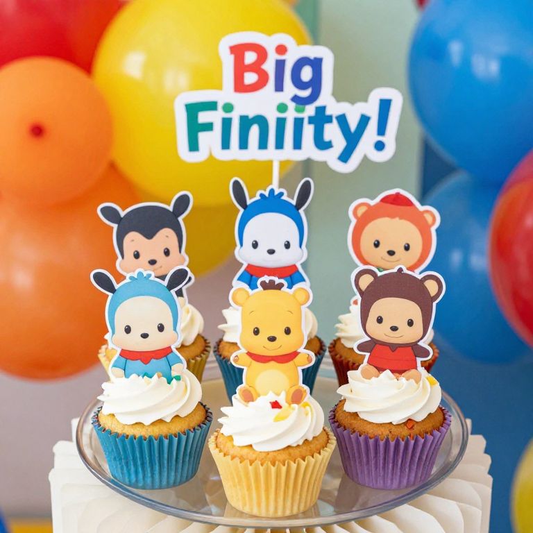 Photograph of colorful, cartoon character toppers on cupcakes, "Big Finity!" text above, vibrant balloons in background, characters include blue-haired,