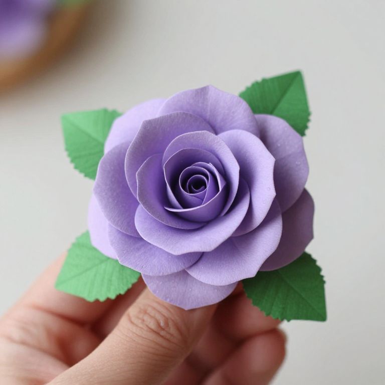 Photograph of a delicate, paper-crafted lavender rose with green leaves, held by a hand against a softly blurred white background.