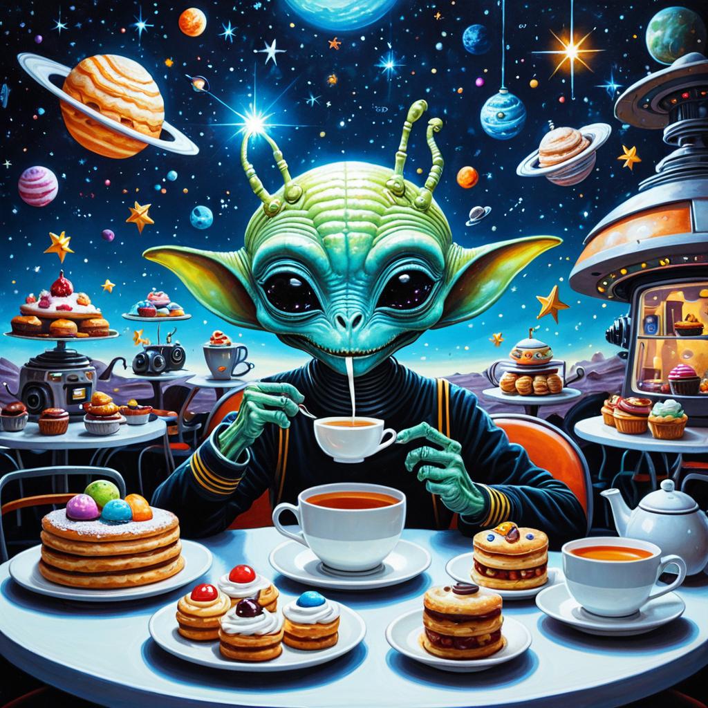 Realistic photo.A whimsical painting of a friendly alien sipping tea, in a surreal space cafe filled with twinkling stars, surrounded by floating pastries, glowing planets, and cheerful robots, created in imaginative and colorful sci-fi art, playful and detailed