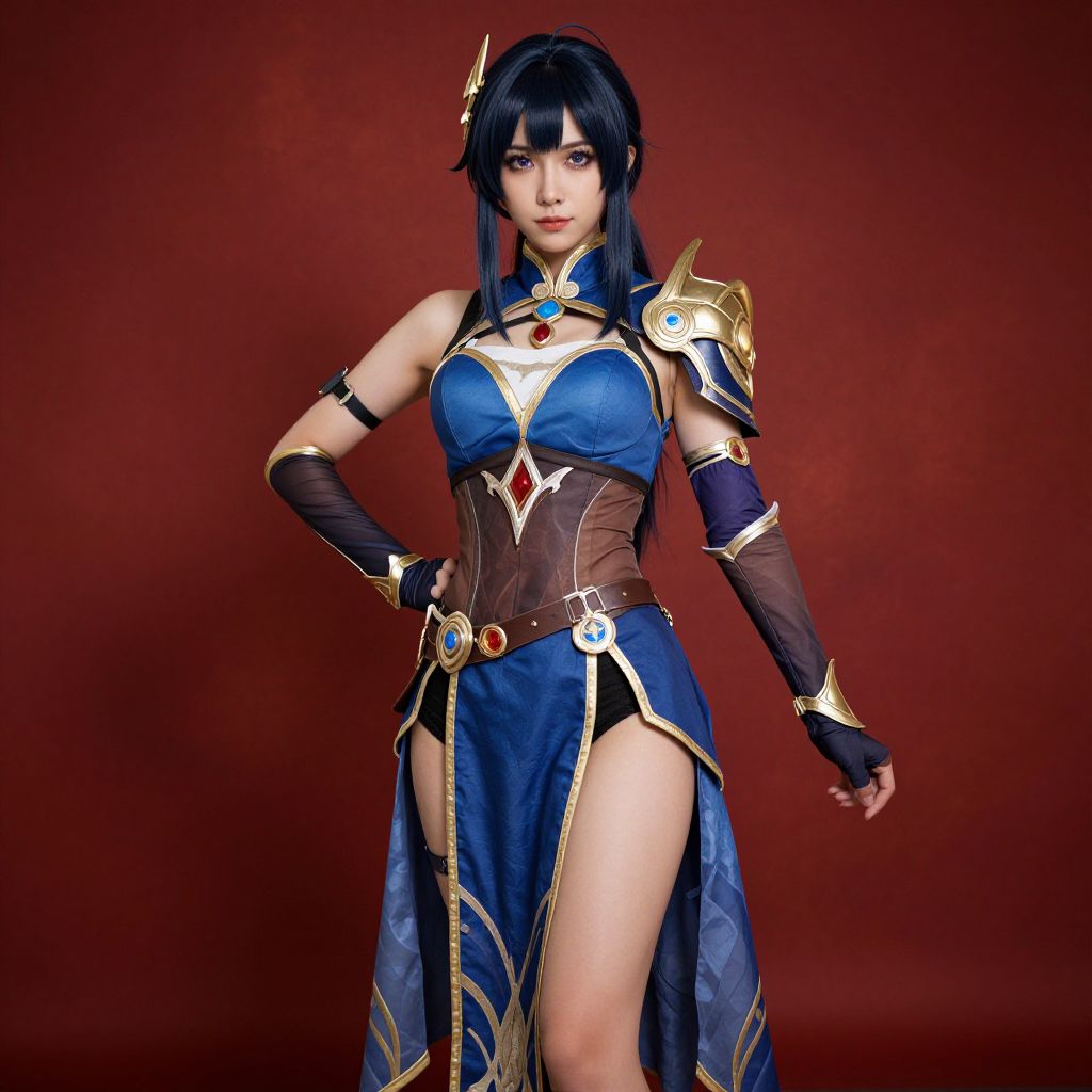 Photograph of an Asian woman cosplaying as a fantasy warrior. She has long black hair with bangs, and wears a blue and gold armored dress with a high slit, revealing her left thigh. The dress has brown leather accents and a red gem at the collar. Her shoulder armor is gold with intricate designs. She has black fingerless gloves and a confident stance with one hand on her hip. The background is a solid, rich red. Her makeup is dramatic with dark eyeliner and red lipstick. The image has a 3D CGI effect, giving it a slightly surreal, polished look.