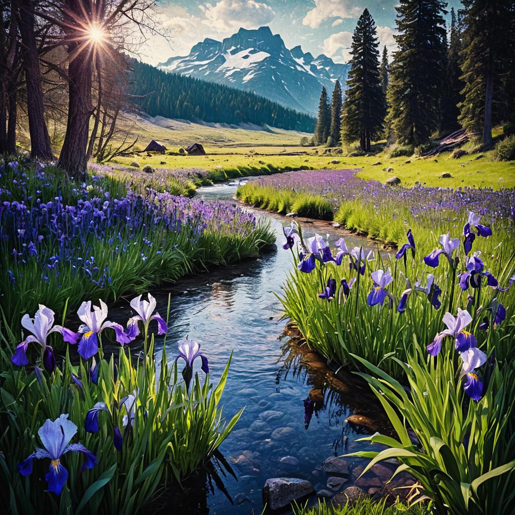 Fantasy meadow landscape with crystal-clear river and violet irises. Digital art with painterly details creating a serene, magical atmosphere.