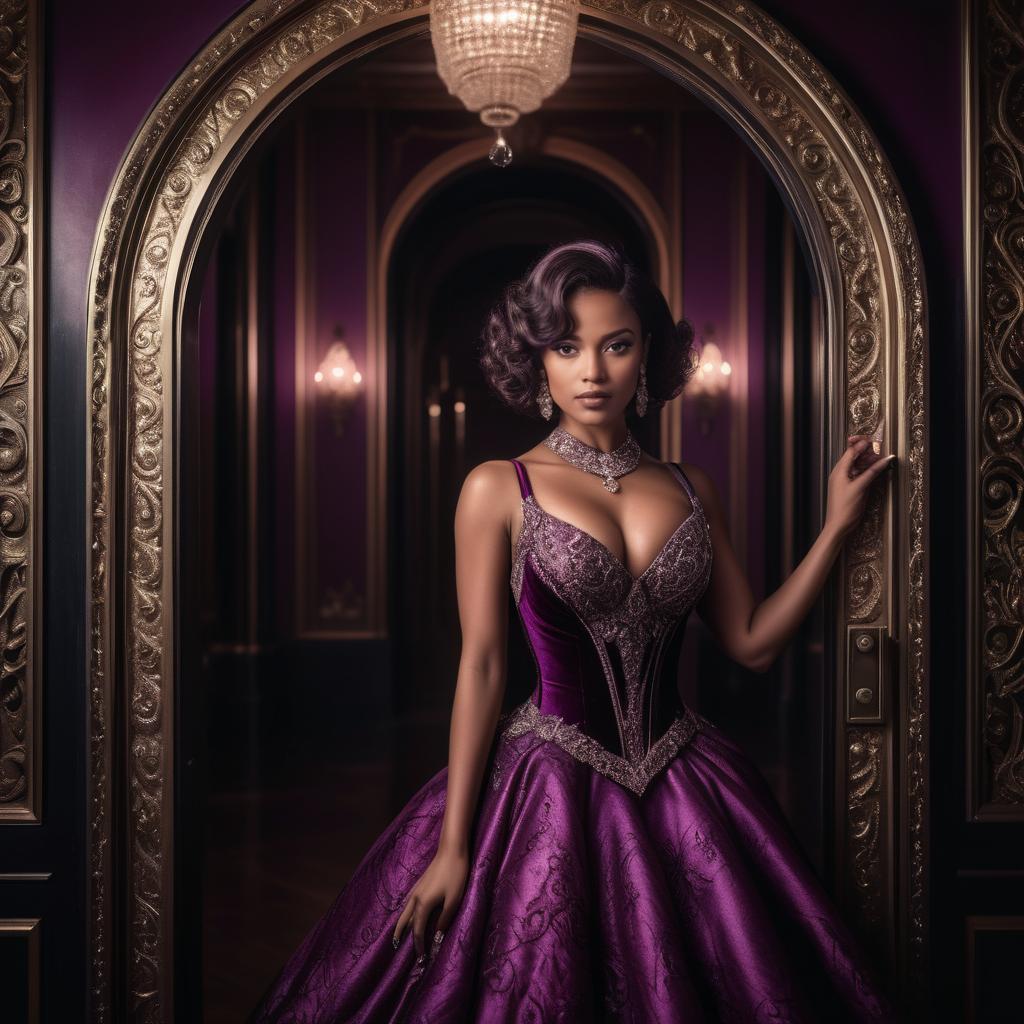 Exotically beautiful masquerade beauty, with chic bob with curls, violet eyes, intricate diamond face, bosomy curvaceous physique, broad bottom, hourglass figure, wearing plum velvet ball gown, standing in an elegant masquerade ballroom door frame, 8k photo, film noir style, elegant lighting, detailed features, comely gaze