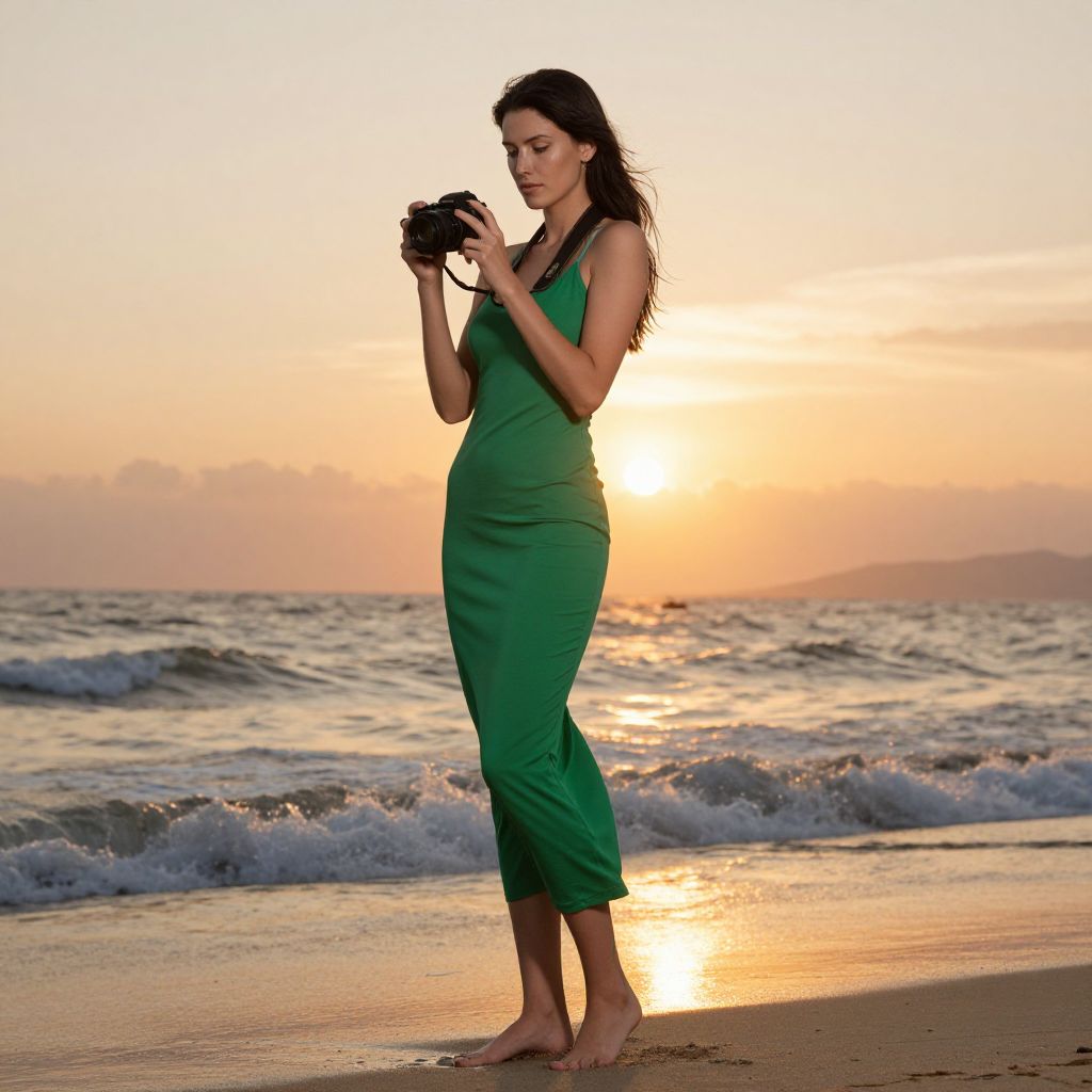 A tall, slim woman with a green dress, standing on a beach at sunset, holding a camera, with the sun setting behind her and the ocean waves gently crashing at her feet