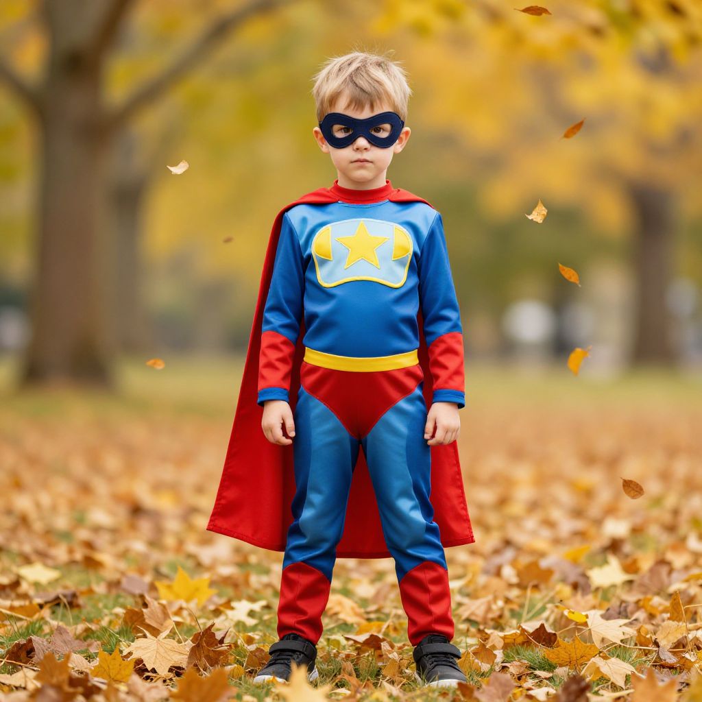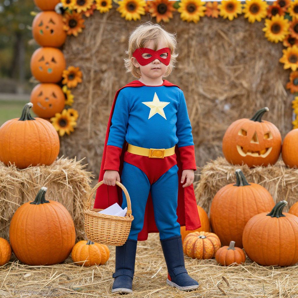 A young child in a superhero costume, standing in a pumpkin patch with a basket, surrounded by hay bales and autumn foliage.