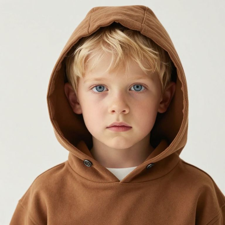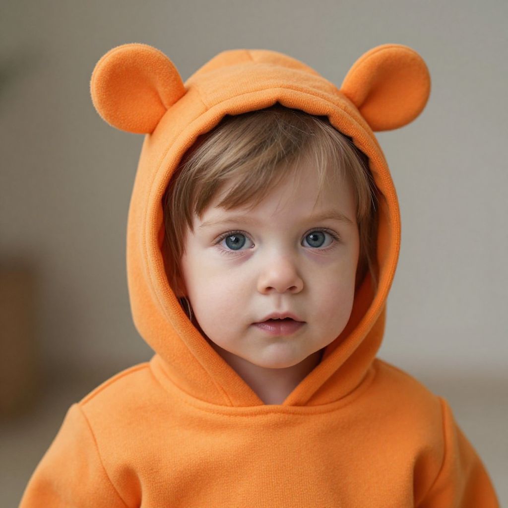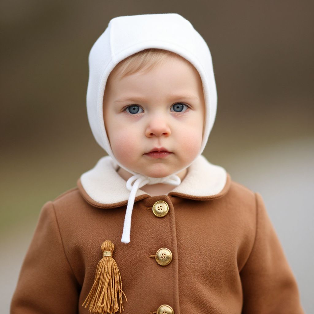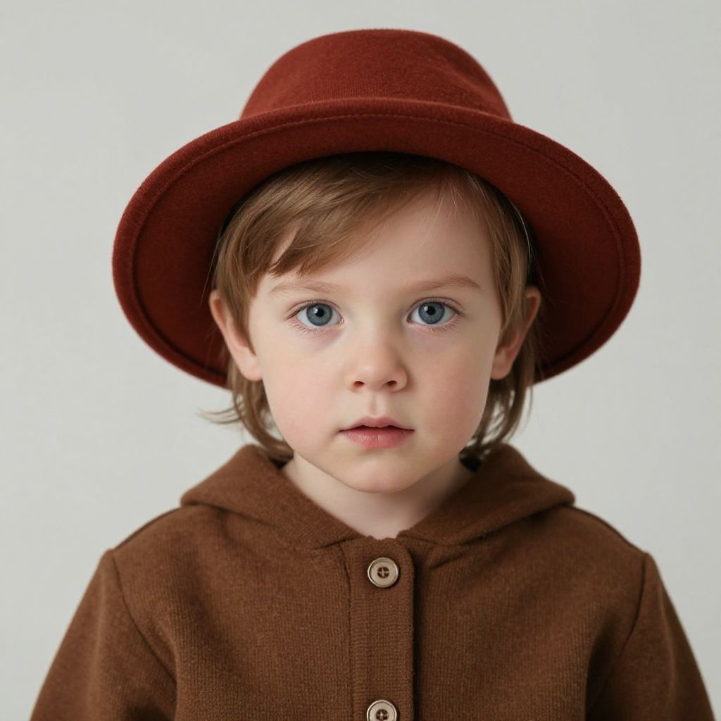 A child is wearing a brown outfit with a red hat on top. The child has brown hair and blue eyes.