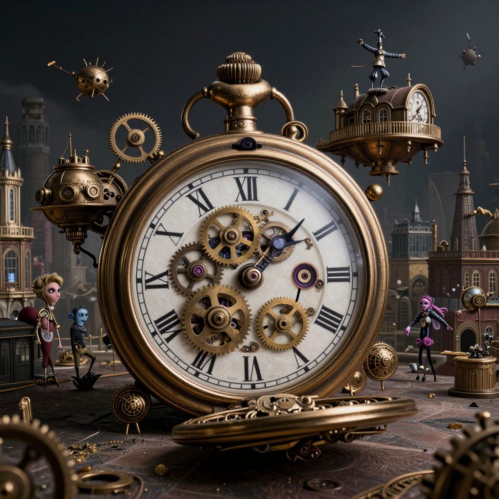 An imaginative digital artwork showcases an enchanting blend of surreal elements with a steampunk-inspired setting. At its heart lies an oversized pocket watch, adorned with intricate gears and cogs reminiscent of clockwork mechanisms, dominating the foreground. This fantastical landscape extends into a Victorian-style cityscape suspended within the watch's inner workings, inhabited by whimsical creatures that merge mechanical forms with human features. The scene is bathed in moody lighting, casting long shadows to accentuate the stark contrasts between light and dark elements scattered throughout this dreamlike world.