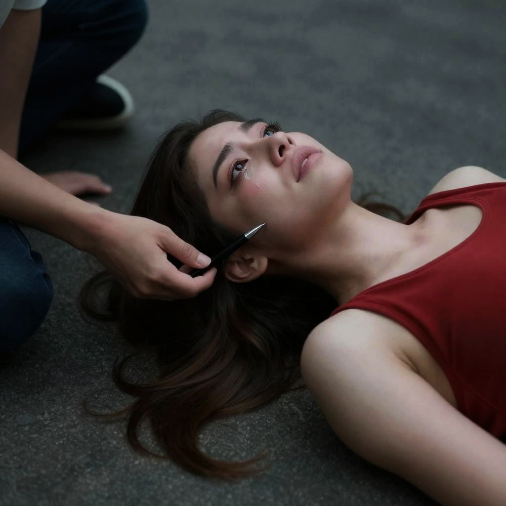 Photograph of a woman with long brown hair lying on the ground, eyes wide open and teary, wearing a red sleeveless top. Hand holding a black pen is near her left cheek. Shadowy background. Intense expression. Two people.