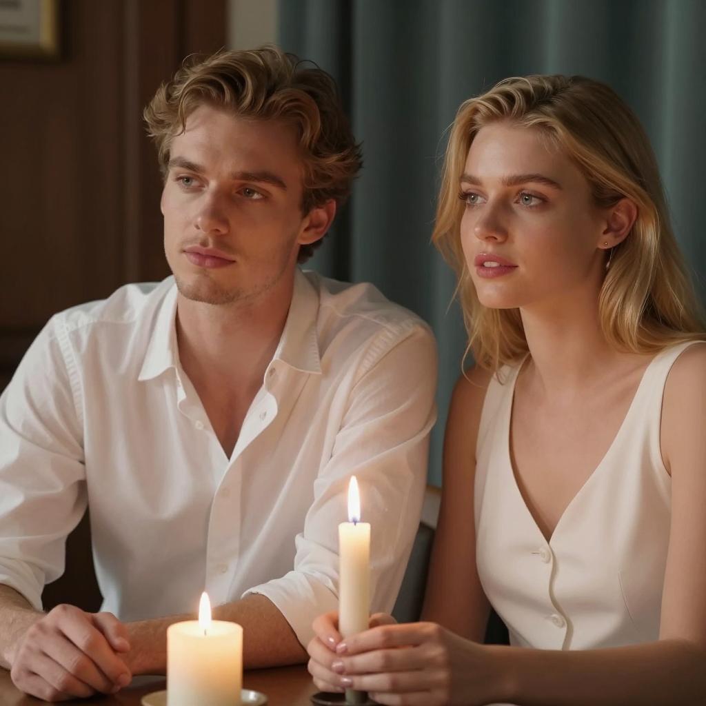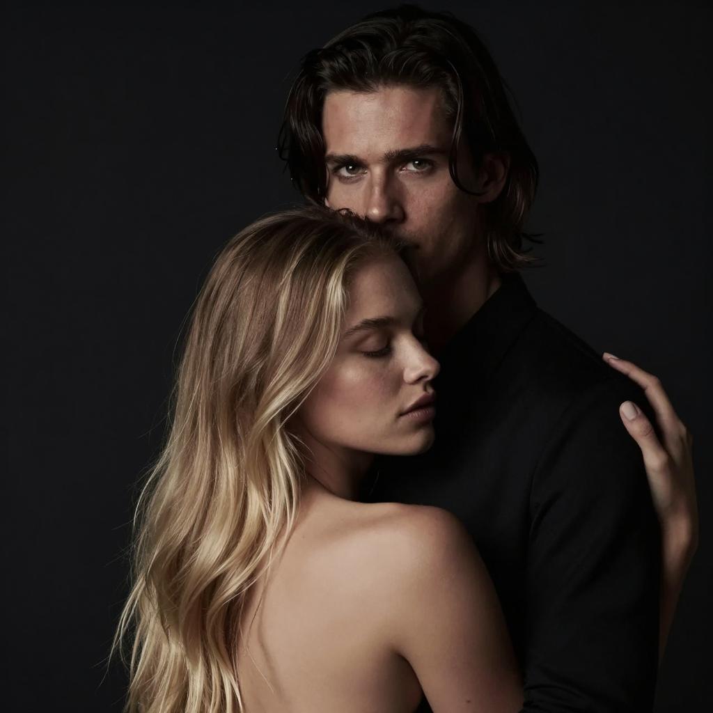 Photograph of two people in dim, orange lighting. Man in foreground, dark hair, intense gaze, wearing dark shirt. Blonde woman in background, leaning on man, wearing a red top, face partially obscured. Cityscape visible through window on left.