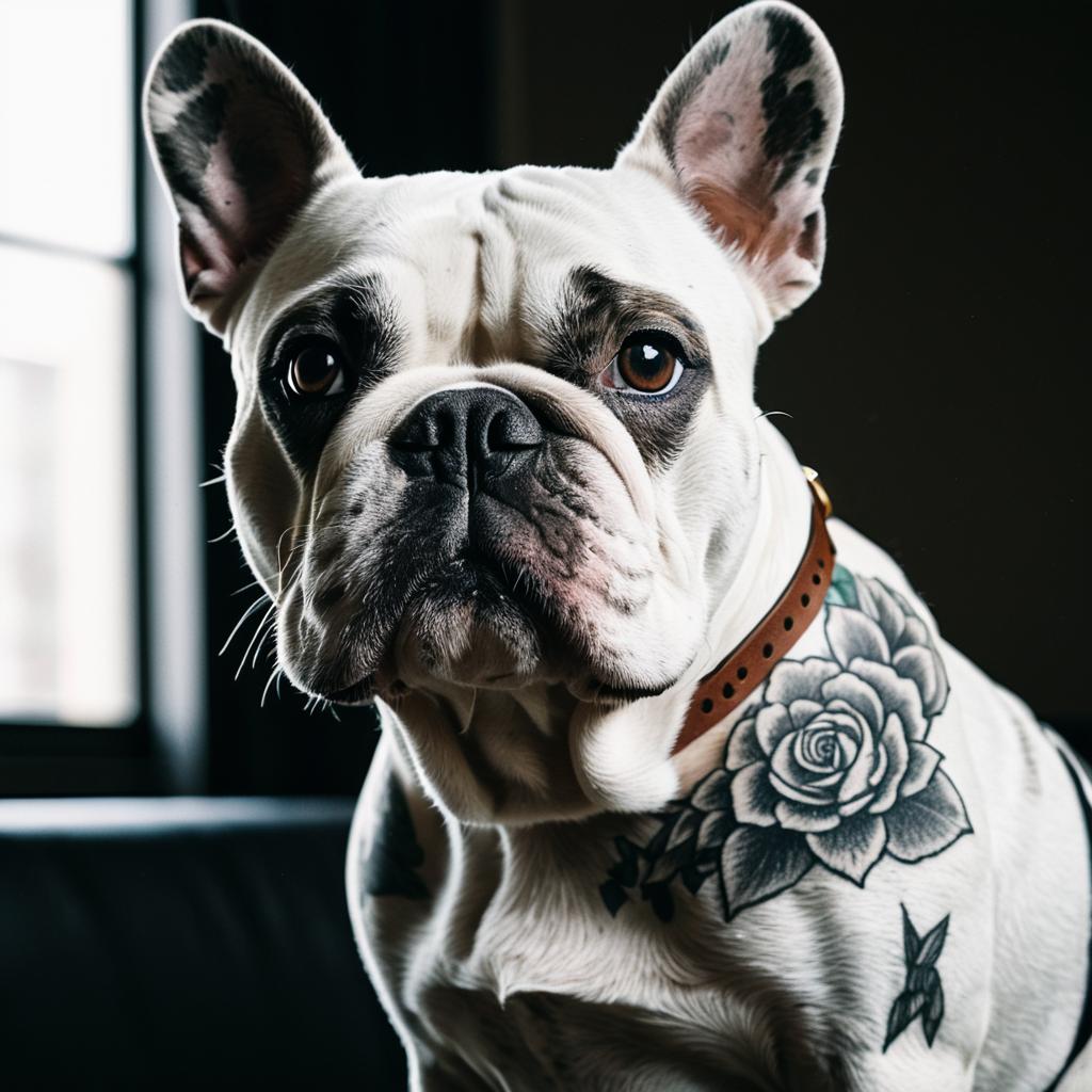 Beautiful tattooed Boston Bulldog, high-resolution and realistic, 18k resolution, shot on Sony A7R IV with 135mm lens, natural lighting, high visual impact, realistic and detailed
