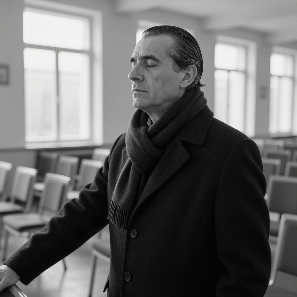 Black-and-white photograph of a middle-aged man with slicked-back hair, closed eyes, and a neutral expression. He wears a dark coat and a thick scarf. His right arm extends outward. He stands in a large, sunlit room with rows of chairs and vertical windows in the background.