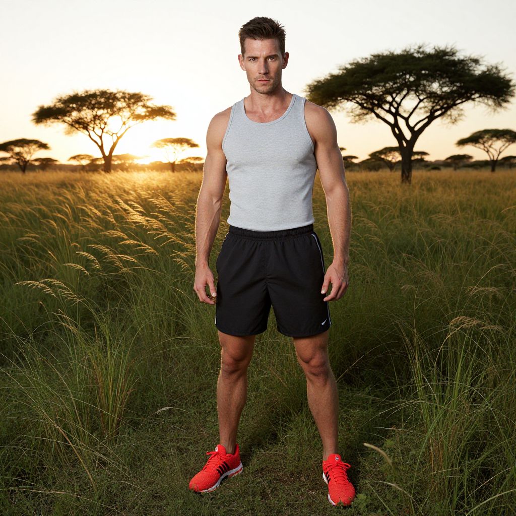 A man, light gray tank top, black performance shorts, vibrant red tennis shoes, quick-dry fabric, elastic waistband, lush green savannah, golden grasses swaying, acacia trees silhouetted at sunset, overhead shot, focused expression. Man has masculine face and piercing eyes
