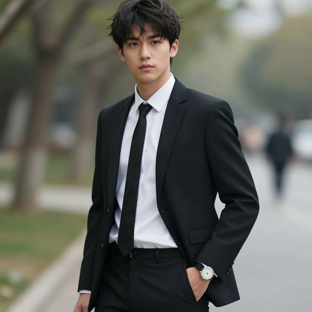 "prince purple outfit, 1boy, male focus, solo, black hair, outdoors, blurry, looking at viewer, day, blurry background, standing, building Realistic photo of casual sexy person with pretty face"